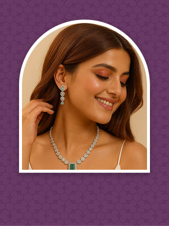 Shop Zarina Emerald Green American Diamond Necklace Set with Earrings. Silver plated finish, sparkling AD...